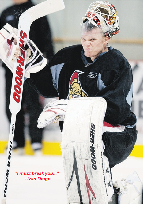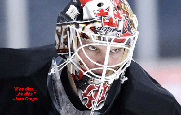 Conrad and I were discussing the Ottawa Senators goaltending whoas – NOW STAY WITH ME I KNOW THIS IS HARD TO BELIEVE BUT IT’S TRUE! I opined that I think to truly be a great goalie it is to your advantage to be a ruthless maniac. I think in terms of what could be considered fantastic goalies Martin Brodeur might be the only “Laid Back” great I can think of…but maybe that can be attributed to his making love this wife’s sister to take the edge off of playoff stress (thanks for the hot tip @seanavery!)