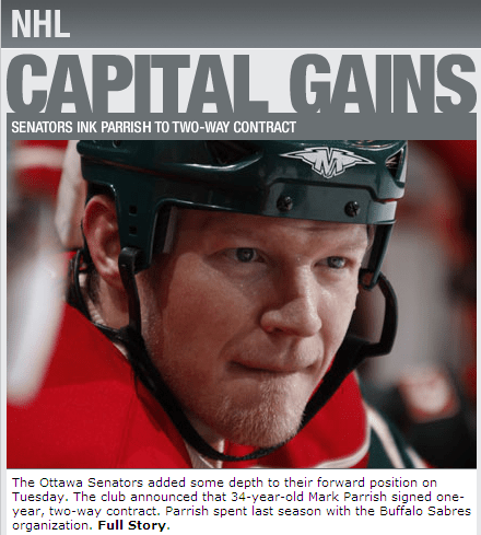 Look, as a person who doesn’t understand the pressures of pandering toToronto fans writing DAILY about –Toronto and occasionally the other Canadian teams NHL hockey in the summer for a ravenous, ravenous readership, I accept I look a bit like a jerk here. I know it’s a bit unfair to pick at the overuse of a terrrrrrrrrrrrrrrrrrrrrrrrrrrrrrrrrrrrrrrrrrrrrrrrrrible pun but good gravy I have seen this old grey mare trotted out for virtually every signing the Senators or Washington Capitals have made since the twitternet was invented 2 years ago. Anyway, is it JULY or is it JULY!? Great post, me! Sound off in the comment section about what pun YOU would have used to celebrate the signing of who is it again…let me just cheeeeeeeck tsn.ca/nhl like a jerrrrk …right! What pun would YOU have used to zellerbrate the signing of Mark Parrish to his two way contract? I suppose I will contribute, PARRISH THE THOUGHT OF SIGNING MARK PARRISH OTHER NHL TEAMS! BOOOOOOOOOOOOOOM! (I’m including the “Boom” part in my headline)