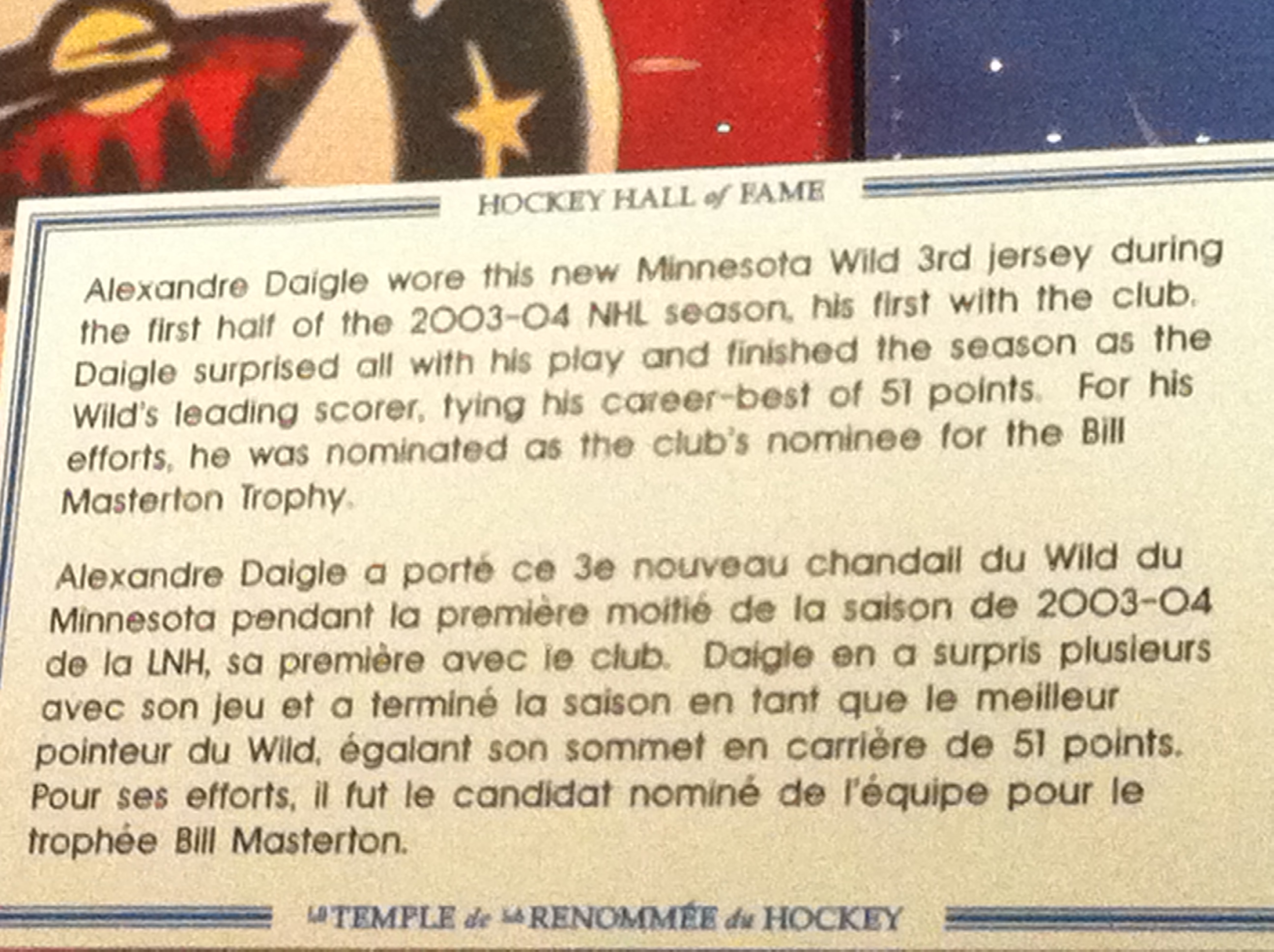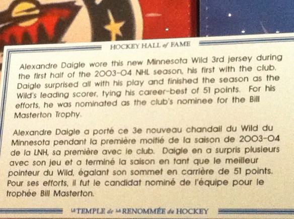 Speaking of lookin’ good in the early nineties (seriously how often can one say that?) …A week ago, if you had told me I’d see a picture of Bobby Bustler in the HHOF…I’d say, “well, I suppose he was AHL all star game MVP a couple years ago and he recently won the Calder Cup, so that’s a thing…” BUT, BUUUT if you told me there would be ANYHING to do with Alexandre Daigle up in that piece? I would have slapped you so hard that you would instantly get a phone call from your moms and she’d say, “Baby, you okay? I just got a strange pain inside my face.” In case your eyes are bleeding and you cant see what that thing says: