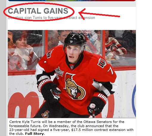 Ottawa Senators Re-Sign TSN to Five More Years of Flogging Dead Headline Horse, Rename Team “The Capital Gains” Posted on August 29, 2012 by Varada Analysis to come. But in the meantime, TSN absolutely kills it with yet another example of absolutely not phoning it in. Update: 1:36pm EST. TSN Uses more prominent font, adds voice bubble for story with great title… Share this: Click to share on Facebook (Opens in new window) Facebook Click to share on X (Opens in new window) X Like Loading... Related