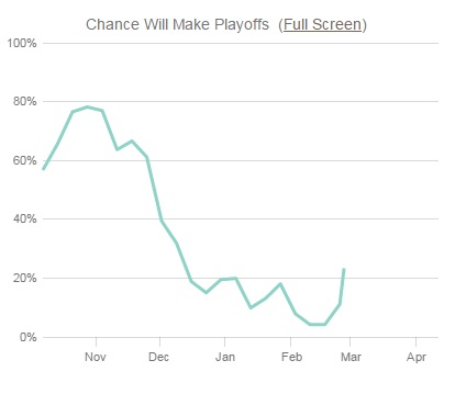 Four Andrew Hammond starts. Four wins. .962 SV% and a 1.15 GAA. And a nice little curve there on the end of the playoff probability chart. Like a hook in our hearts.