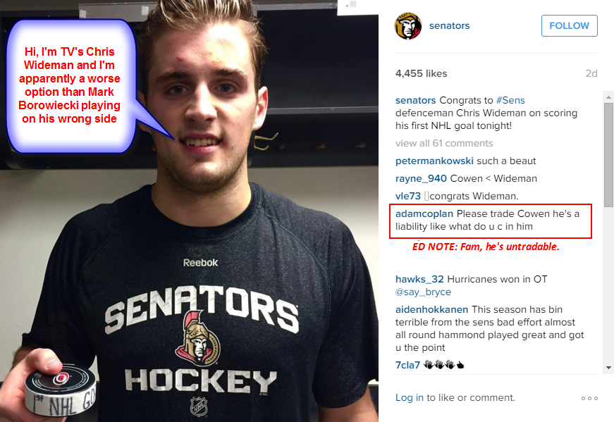 K, is that the real competition? Why does it have to be Chabot Vs. Guy who is way better than Borowiecki again? Seriously, we’ve got this apparent X’s and O’s detail based, strategic mastermind in Boucher, a former head coach with a Cup and 15 seasons experience in Crawford and some big timey eye in the sky video coach now. I’m hoping at some point they at least N O T I C E that Borowiecki is a hot mess. I’m sure deciding when a first round pick’s first game comes is a tricky decision (right Ozton Mayhews?) and perhaps Boucher feels his game would be best suited against the hung and youngry™ Coytoes on Tuesday. I just thought I would be angry about that for a minute…let’s see anything else? Oh, Matt Puempel is in and Phil Varone is out. I have very little to say about this. I’m not saying I’m ready to throw in the towel on Puempel but it’s gonna be tough for a player like him on the 4th line. I suppose Kelly makes for a bit more of a chance for Pumps to do something on the bottom line than last year but I don’t expect much. Life is about lowered sexpectations for late first round picks.